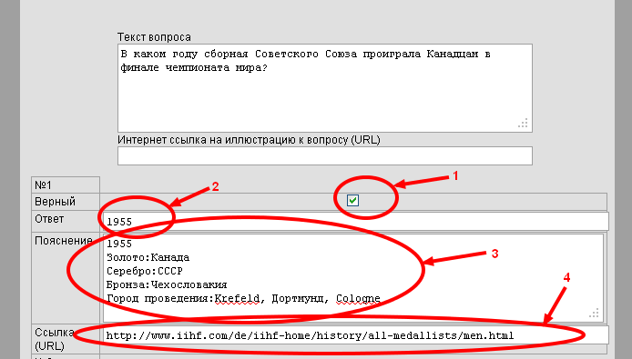 1. «Птичка» ставится если ответ верный. 2. Текст самого ответа, который предлагается в списке вариантов 3. Пояснение, текст которого показывается в случае не верного ответа. 4. Интернет ссылка на источник если таковая имеется