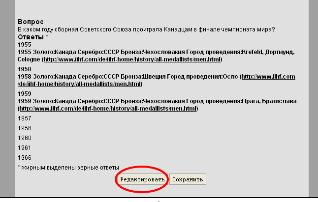 2. Вам покажут Ваш вопрос с Вариантами ответов и гипертекстовыми ссылками на источники (в примере ниже три верных ответа, студенту покажут всегда только один верный ответ, выбранный случайным образом: студент института физкультуры обязан знать все три раза), интернет ссылки на источники активны, их можно проверять. Если Вы захотите отредактировать вопрос или пояснения, нажмите «редактировать», если все верно, нажмите «сохранить» еще раз. Кстати, в этом месте можно скопировать заданный Вами вопрос в файл для дальнейшей работы, например использования в печатных методичках.