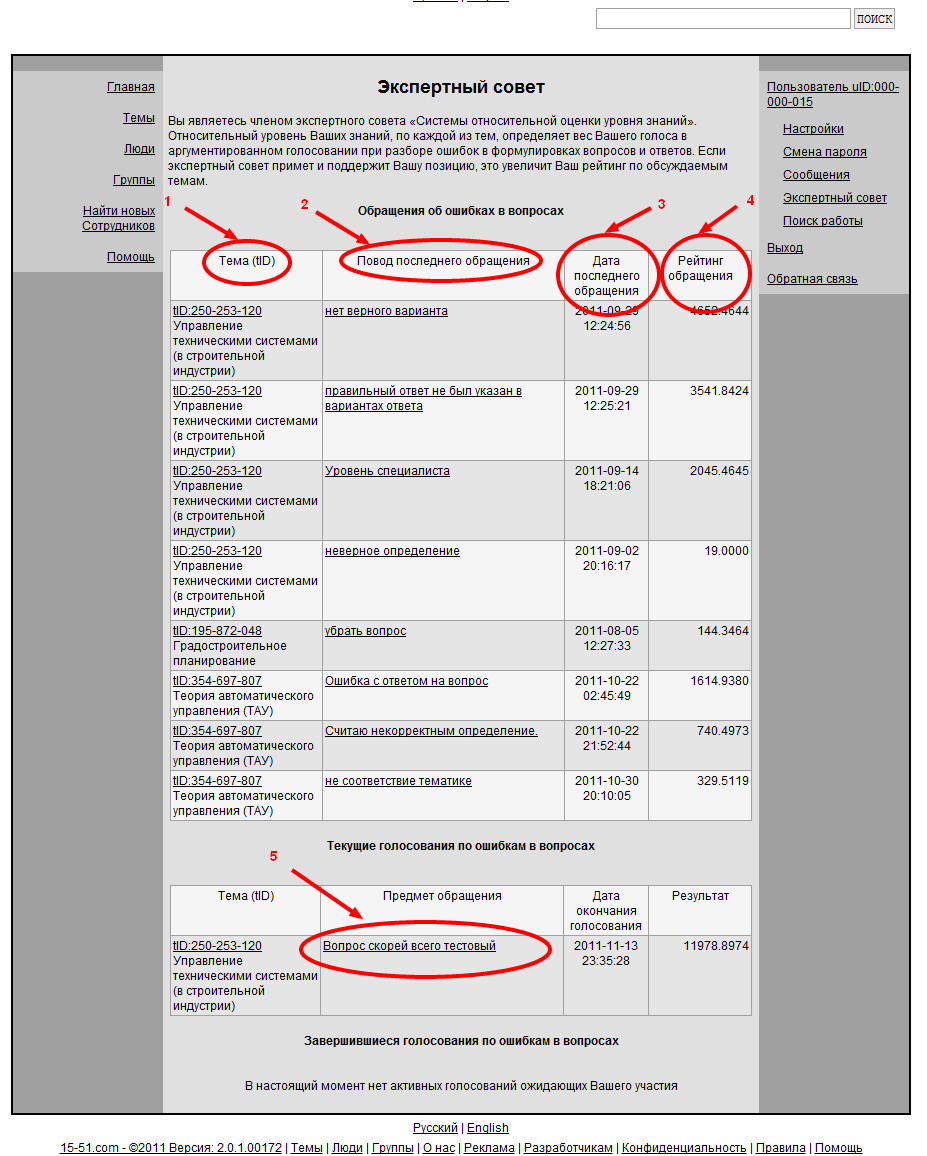 Просмотр жалоб пользователей на ошибки в формулировках вопросов и ответов, временная остановка ротации темы, и постановка вопроса о продолжении ротации темы на голосование. Член экспертного совета может остановить ротацию любого вопроса на ошибки, в формулировке которого, пожаловались пользователи, по теме, где у него есть рейтинг, при этом он должен аргументировать свое решение, если экспертный совет поддержит его решение, то рейтинг в этой теме вырастет, если нет, то уменьшится.