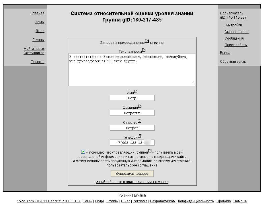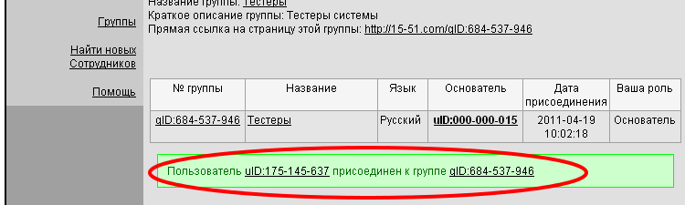 5.3. В случае удачного присоединения, появится соответствующее сообщение, а присоединенный пользователь появится в списке группы со всеми персональными данными, доступными руководству группы
