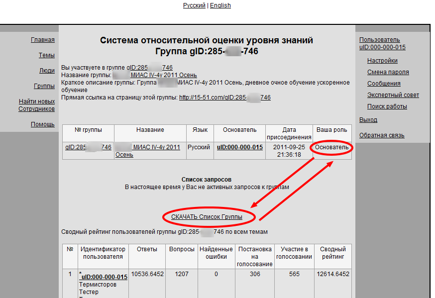 Обратите, пожалуйста, внимание, что ссылка «Скачать список группы» выводится на странице группы для управляющих группой и основателя группы